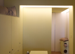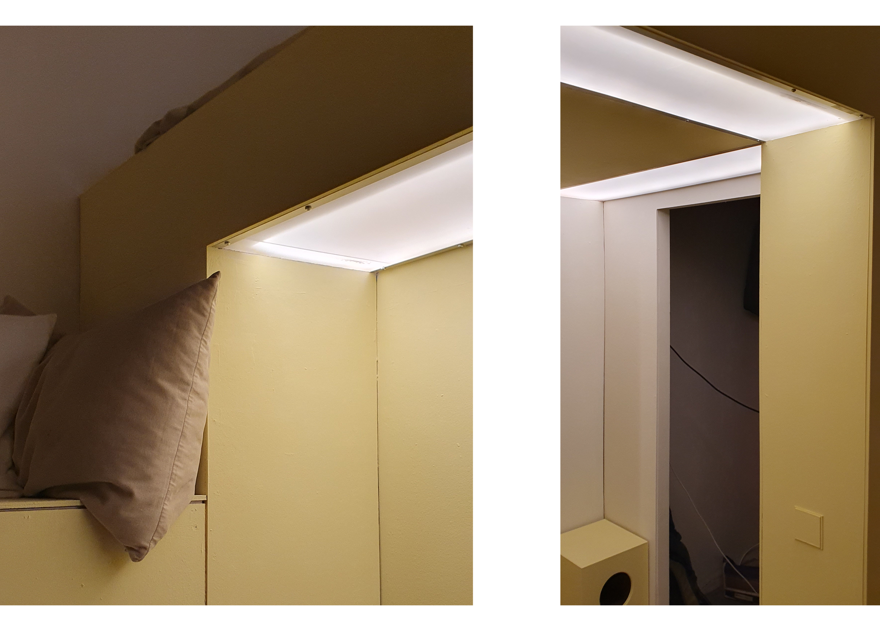 Hell genug, um putzen zu können, so eingebaut, dass es alle Ecken erhellt, aber nicht blendet. Es unterstützt die Konturen der gestapelten Cubes, von denen es selbst Teil ist und schafft so eine super gemütliche Atmosphäre.