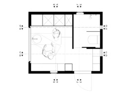 The heights of the grid (45 cm, 75 cm) are taken up again in the bathroom. The minimal installation of the shower partition leaves a relatively large amount of space for movement when washing.