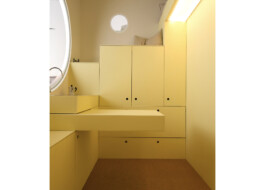 Durch gestapelte Elemente, in Analogie zu einer Murmelbahn, entstehen verschiedene Blickbeziehungen und ein wandelbarer Wohnbereich. Aus einem Schrank wird zur Raummitte ein Kinderbett gezogen, der Esstisch geschwenkt, und die zentrale Fläche wird für Spiel und Interaktion genutzt - klettern und entdecken ist erwünscht, während die Eltern immer in Reichweite sind.