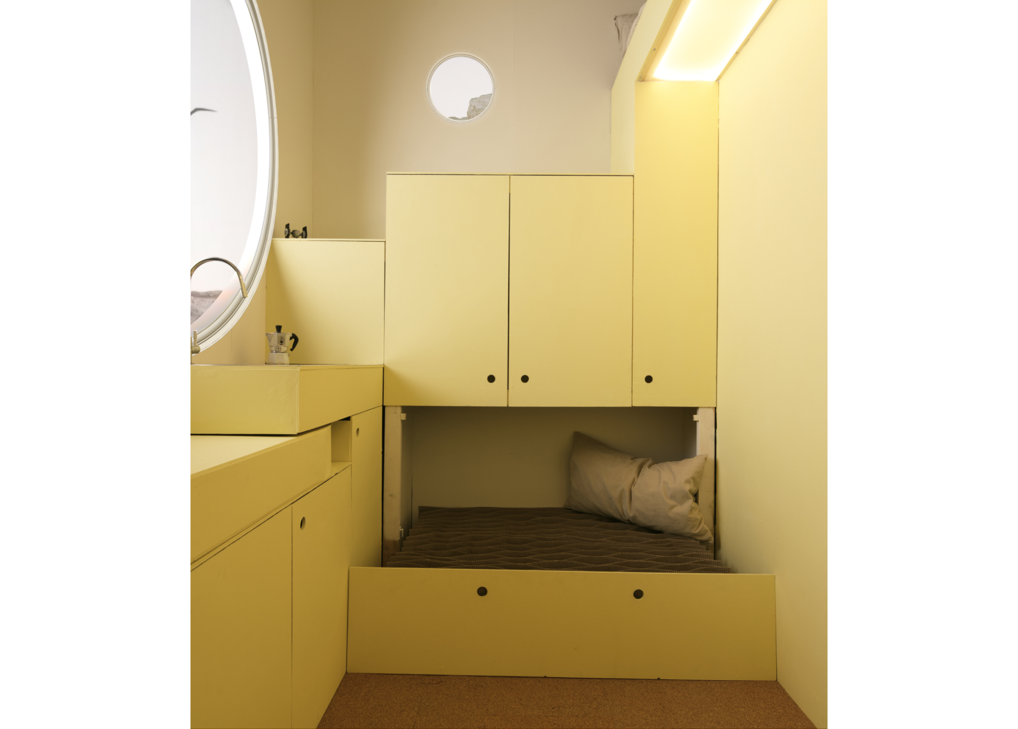 At bedtime, the central room becomes a children's bedroom. It consists of a pull-out construction made of cardboard honeycomb in accordion style.