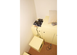 Die Unterkonstruktion selbst ist 30 cm hoch. Im Stauraum oberhalb kann eine dreifach geklappte, 15cm hohe Matratze verstaut werden; im seitlichen, schmalen Schrank das Bettzeug. Mit dem Fußraum innerhalb des Schranks, entsteht so ein 135cm x 120cm großes Bett.