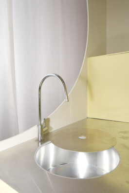 Ein Cube mit Edelstahloberfläche, abdeckbarem Waschbecken und 360° drehbarem Wasserhahn schwebt als Küche über dem Tisch.